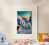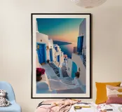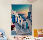 Una scena radiosa delle strette scale bianche di Santorini, che si fondono perfettamente con il blu sereno del Mar Egeo. Le porte e i fiori vivaci aggiungono sprazzi di colore, mentre il sentiero si snoda con grazia attraverso quest'isola idilliaca. La composizione cattura la bellezza senza tempo e l'essenza tranquilla della destinazione più famosa della Grecia.