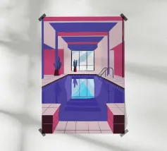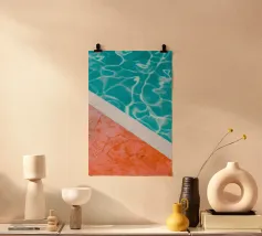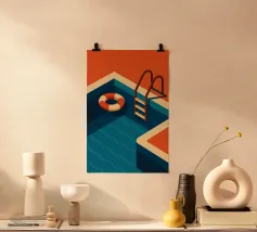 Poster raffigurante una piscina estiva con una scala arancione e riflessi d'acqua stilizzati. Un gioco di ombre, luci grafiche e una tavolozza solare. Perfetto per un look vintage e rinfrescante.