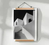 Poster in bianco e nero dell'architettura mediterranea: una scala monumentale che si snoda tra pareti immacolate e archi luminosi, sotto un cielo scuro che accentua il contrasto. Linee sinuose, dolci ringhiere e ombre grafiche creano una prospettiva zen e contemporanea verso l'alto. Un elegante poster da parete per il soggiorno, il corridoio o la camera da letto, che amplia visivamente lo spazio e si abbina a decori scandinavi, giapponesi, wabi-sabi o minimalisti.