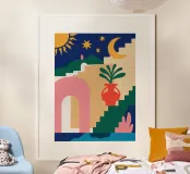 Una scena d'interni stravagante e astratta con una scala rosa, piante in vaso e un sole e una luna nel cielo visti attraverso un arco. L'opera d'arte è un paesaggio da sogno giocoso e bohémien.