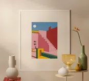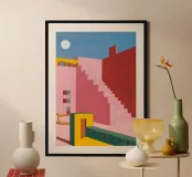 Un'opera architettonica di grande effetto, con una lunga scala rosa che sale verso un sole o una luna gialli e luminosi in un cielo blu scuro. La composizione è audace, minimalista e fortemente simbolica.