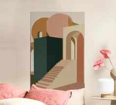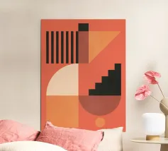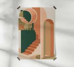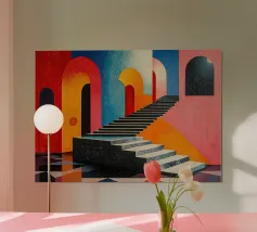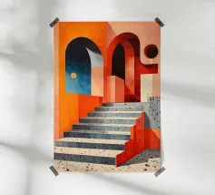 Primo piano astratto e minimalista di una forma architettonica, con una scala bianca e spoglia su una parete arancione con una finestra circolare nera e ombre profonde.