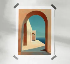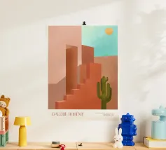 Un poster artistico che presenta un'architettura astratta con scale geometriche e calde tonalità arancioni sotto un cielo blu brillante. Ideale per una decorazione moderna e originale della cameretta dei bambini, questo visual evoca design, creatività e prospettiva. Perfetto per stimolare l'immaginazione dei piccoli sognatori.