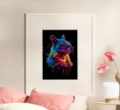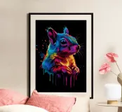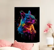 Uno scoiattolo curioso si affaccia vivacemente dal quadro, raffigurato con colori intensi e brillanti su uno sfondo nero. La tavolozza dei colori spazia dal blu intenso e dal rosa brillante al giallo caldo e al rosso vibrante. I passaggi sono fluidi e ricordano le pennellate, mentre singoli schizzi e gocce di colore conferiscono al motivo un effetto dinamico, quasi esplosivo. L'animale appare vigile e vivace, con dettagli finemente lavorati nella sua pelliccia e un grande occhio lucido che guarda direttamente lo spettatore.