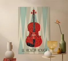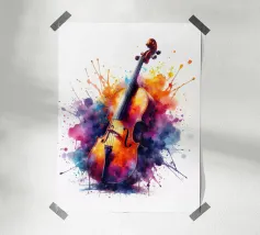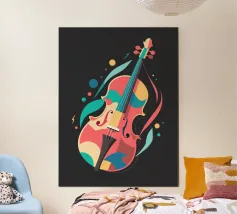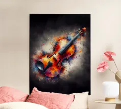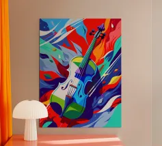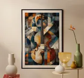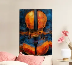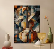 Un'opera d'arte astratta di grande impatto che raffigura un violino in stile cubista, con forme geometriche sovrapposte e una ricca tavolozza di colori di tonalità terrose, blu e oro. La composizione enfatizza la consistenza, la profondità e il movimento.