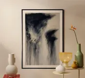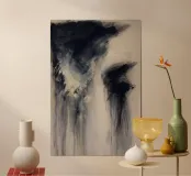 Questo dipinto astratto presenta tonalità di crema, blu e nero con molti segni intricati. Questo pezzo di lusso senza sforzo può essere il punto di riferimento perfetto per le vostre pareti o elevare istantaneamente i vostri articoli per la casa, gli accessori o l'abbigliamento.