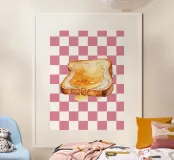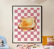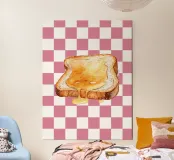 Una fetta di pane tostato è ricoperta da una generosa quantità di miele, la cui tonalità dorata contrasta con lo sfondo rosa e bianco a scacchi. La composizione, semplice ma vivace, mette in risalto la dolcezza appiccicosa del miele che brilla sotto la luce.