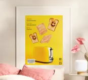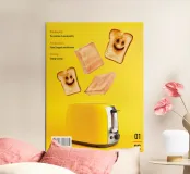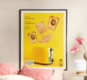 Fette di pane tostato con facce sorridenti fluttuano sopra un tostapane giallo. Sullo sfondo sono presenti testi sul confezionamento, la produzione e la miscelazione, che sottolineano la sostenibilità e il risparmio energetico.