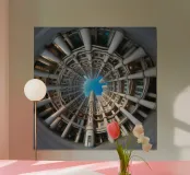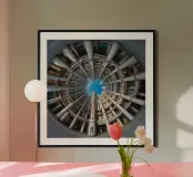 Un suggestivo disegno architettonico circolare caratterizzato da file concentriche di alte colonne ed edifici interconnessi. La prospettiva fisheye enfatizza la simmetria geometrica e si apre su un cielo azzurro e limpido, creando una scena urbana suggestiva e coinvolgente.