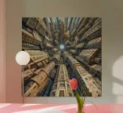 Una surreale visione fisheye di strutture urbane torreggianti con dettagli intricati e modelli simmetrici, che convergono verso un cielo radioso. Il design architettonico stratificato evidenzia l'innovazione moderna e la creatività artistica.