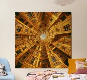 Una vista ipnotizzante di pareti architettoniche dorate che si curvano verso l'interno per formare un motivo circolare, creando un radioso disegno simmetrico. I dettagli intricati e i toni caldi evocano grandezza e raffinatezza artistica in una prospettiva surreale.