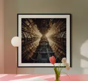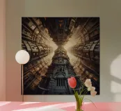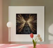 Una rappresentazione surreale di strutture architettoniche simmetriche e torreggianti che convergono verso una luce centrale incandescente. I disegni intricati, l'illuminazione calda e la prospettiva drammatica creano un'immagine impressionante e ultraterrena.