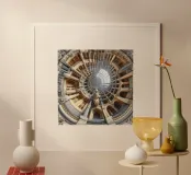 Questa immagine mostra un'intricata architettura circolare con colonne di pietra ornate, una statua centrale e un soffitto di vetro. La prospettiva surreale crea un effetto tunnel, attirando lo sguardo verso il centro della composizione.