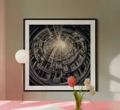 Questa immagine mostra una scena architettonica surreale con edifici concentrici disposti circolarmente. I toni monocromatici aggiungono un tocco vintage, mentre il centro illuminato dal sole crea profondità e un'illusione di altezza infinita.
