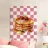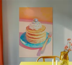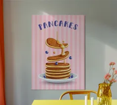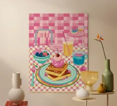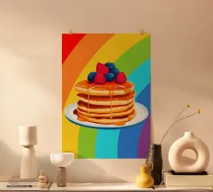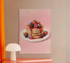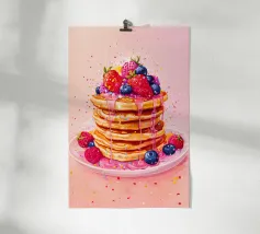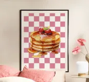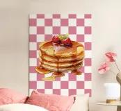 Una pila di pancake è sormontata da fragole e irrorata di sciroppo, su uno sfondo a scacchi bianchi e rosa. I colori vivaci e lo sciroppo lucido creano un aspetto invitante.