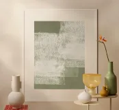 Pittura acrilica minimalista con pennellate di colore bianco su sfondo verde salvia e verde oliva.