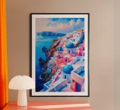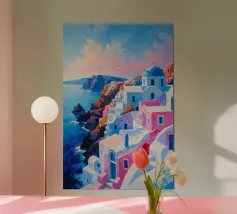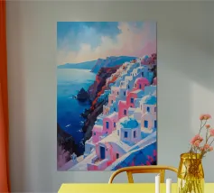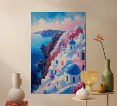 Questo dipinto impressionista mostra vividamente le cupole blu a cascata di Oia, a Santorini, sullo sfondo delle suggestive acque del Mar Egeo e delle tonalità dorate di una mattina mediterranea. Il gioco di luci e ombre sull'iconica architettura crea un'atmosfera da sogno. I dettagli della costa frastagliata e dei tetti vivaci catturano il fascino unico e la serenità di questa amata destinazione greca. Questa opera d'arte celebra la bellezza di Santorini e invita a immergersi nello splendore del suo spirito tranquillo e vibrante.