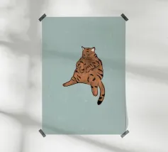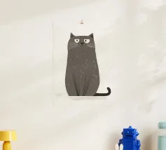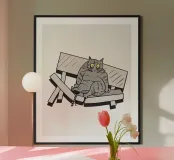 Un disegno divertente mostra un gatto grigio seduto su una panchina rotta nel parco. L'illustrazione ricrea la scena con un tocco comico, esagerando l'espressione del gatto. È come se il peso del gatto avesse causato l'incidente, creando una scena divertente e ironica.