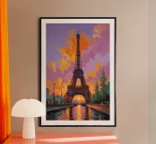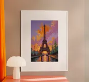 Questo dipinto a olio impressionista mostra la Torre Eiffel in uno splendido spettacolo di tonalità arancione e lavanda. La scena cattura la transizione tra il giorno e la notte, dove il sole scende sotto l'orizzonte, proiettando un bagliore dorato su Parigi. Il riflesso sul canale aggiunge profondità, creando una miscela armoniosa di acqua e cielo. Pennellate decise e texture ricche esaltano la tavolozza vivace, mentre i pedoni sparsi aggiungono vita alla scena. Un tributo quintessenziale alla bellezza della Torre Eiffel e dei tramonti parigini.