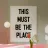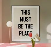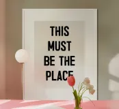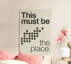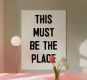 La frase "THIS MUST BE THE PLACE", in grassetto e in caratteri neri, è riportata su uno sfondo bianco. Il testo si distingue per l'effetto leggermente affilato, che gli conferisce un fascino rustico.