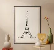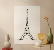 Il famoso simbolo di Parigi, la Torre Eiffel, in un design molto moderno. Lavoro artistico con elementi tipografici.