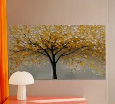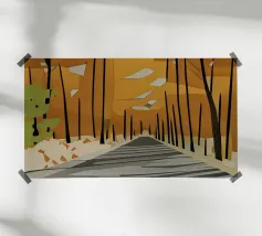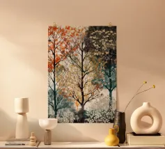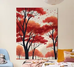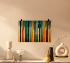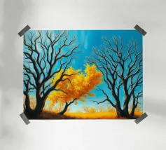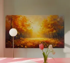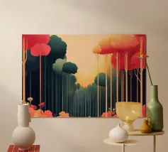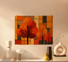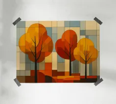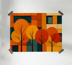 Una splendida rappresentazione astratta di una foresta autunnale con alti tronchi scuri e fogliame dorato. Lo sfondo caldo e luminoso esalta la composizione geometrica, creando un'atmosfera serena e moderna.