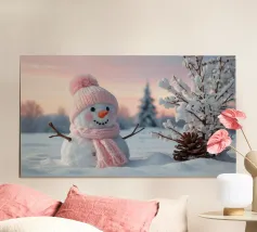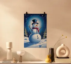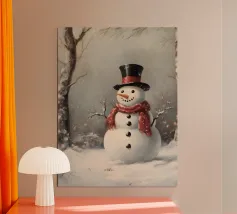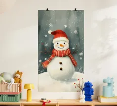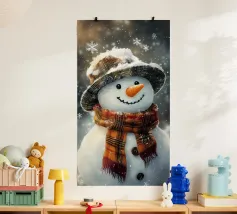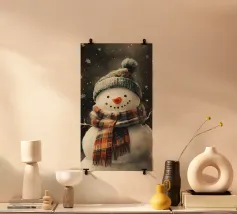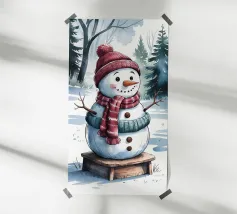 Un allegro pupazzo di neve con cappello e sciarpa a maglia è in piedi carta hahnemühle