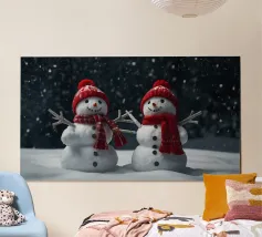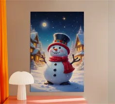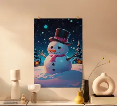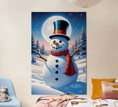 Un pupazzo di neve adornato con un cappello e una sciarpa si gode la serena bellezza di una foresta innevata al chiaro di luna, circondato da fiocchi di neve che cadono.