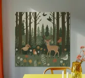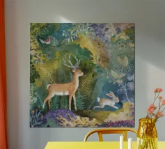 un cervo, uccelli e varie piante in una foresta con alberi ad alto fusto carta hahnemühle