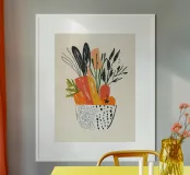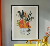 Una composizione moderna e vibrante che celebra la bellezza delle verdure. Forme astratte e colori vivaci conferiscono a questa illustrazione un'atmosfera calda e contemporanea. Perfetta per una cucina dinamica o per un interno vivace.
