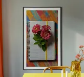 Un taccuino rilegato a spirale presenta tre fiori rosa e foglie verdi, disposti su una superficie di legno colorato, che invitano alla creatività e all'ispirazione.