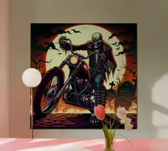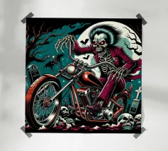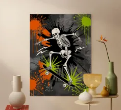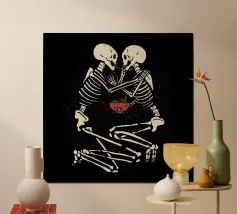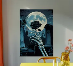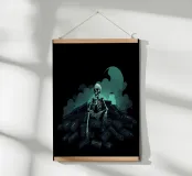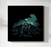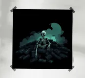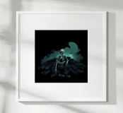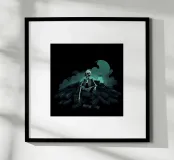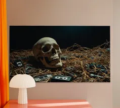 Uno scheletro siede tra vecchie cassette in un'atmosfera spettrale carta hahnemühle