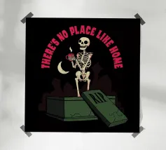 Uno scheletro reclinato in mezzo a una pila di cassette vintage, circondato da una nebbia spettrale e da sagome inquietanti, che evocano un'atmosfera nostalgica e agghiacciante, perfetta per Halloween.