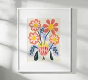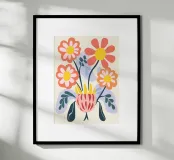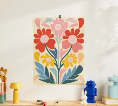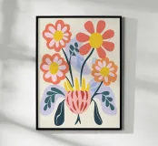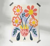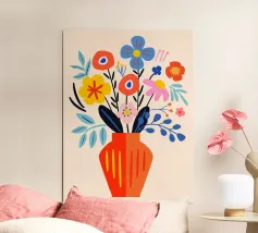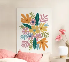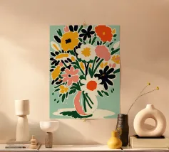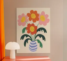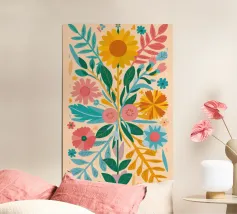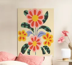 Un vivace e moderno motivo floreale dal sapore retrò: nuclei di fiori giallo brillante, circondati da calde tonalità arancioni e delicati colori pastello, si uniscono per formare un bouquet armonioso in un vaso stilizzato. Completato da sottili sfumature di blu e verde, il risultato è un look unico e senza tempo che illumina qualsiasi ambiente. Perfetto per opere d'arte da parete, tazze, cuscini e accessori per la casa, ideale per gli amanti dell'arredamento di metà secolo, dell'estetica boho e dei design floreali. Un'ispirazione per il soggiorno, la camera da letto o l'ufficio e un regalo affascinante per gli amanti dell'arte e dei fiori.