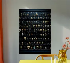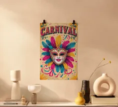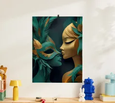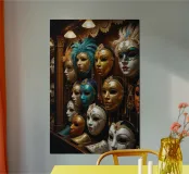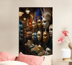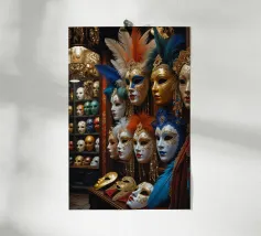 Una splendida collezione di maschere veneziane artigianali esposte in una sontuosa vetrina di legno. Gli intricati dettagli in oro, le ricche piume e i colori vivaci riflettono l'eleganza senza tempo del Carnevale di Venezia. Ogni maschera racconta una storia di mistero, tradizione e artigianato artistico. La calda illuminazione ambientale esalta il fascino del lusso, rendendo quest'opera d'arte perfetta per gli amanti del patrimonio europeo e dell'estetica teatrale. Un must per chi apprezza l'arredamento sofisticato e la bellezza culturale.