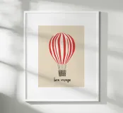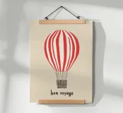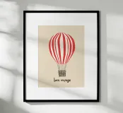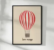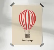 Il motivo mostra la scritta "Bon Voyage" sotto una mongolfiera a strisce bianche e rosse. Il design minimalista su sfondo beige ricorda i poster di viaggio francesi e irradia leggerezza e senso di avventura. Un murale moderno e affascinante per tutti coloro che amano i viaggi e l'avventura.