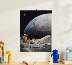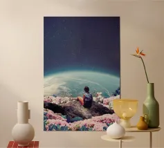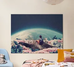 Vivevamo lì. Ricordate? Quel mondo ci sta ancora aspettando. ~ Coppia seduta su una panchina che guarda la Terra surreale retro futuristico stellato composizione romantica. versione orizzontale