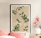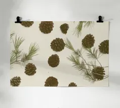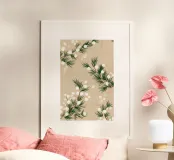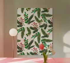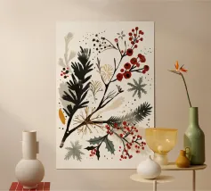 Un morbido motivo botanico dipinto a mano con rami di pino invernale e delicate bacche di neve bianche. Le calde tonalità del beige si fondono con espressivi tratti pittorici per creare un disegno stagionale sereno e naturalmente elegante. Perfetto per aggiungere un'atmosfera invernale e rilassante a qualsiasi interno moderno.