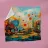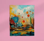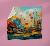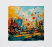 Quadro astratto dinamico che presenta un'architettura surreale, vivaci toni arancioni e blu, alberi astratti e sfere fluttuanti in un paesaggio fantastico. I tratti strutturati e i contrasti decisi creano un'atmosfera onirica ed energica.