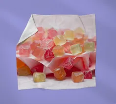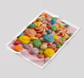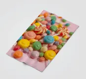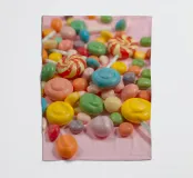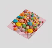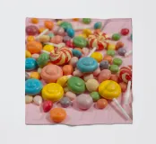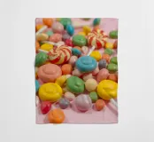 Un vivace mix di caramelle è distribuito su una superficie rosa, che mostra varie forme e colori, tra cui lecca-lecca roteanti e dolciumi rotondi. Questa disposizione giocosa invita a una gioiosa indulgenza.