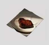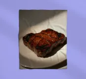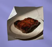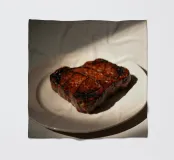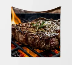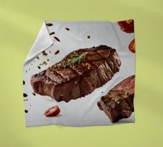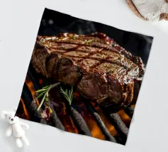 Una bella bistecca alla griglia è adagiata su un piatto bianco, ornato dai segni della griglia. La calda luce del sole mette in risalto i suoi colori ricchi, creando un'atmosfera invitante perfetta per il pranzo.
