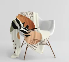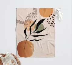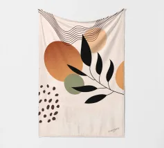 Foglie stilizzate in nero e verde si stagliano su uno sfondo di strisce curve e fluide in morbide tonalità di terra. Il disegno combina elementi botanici con forme geometriche astratte per un look moderno.