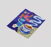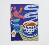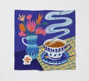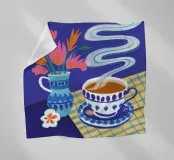 Illustrazione stravagante di una tazza di caffè fumante in una tazza a scacchi blu e bianchi, con fiori stilizzati che fluttuano sopra di essa, su uno sfondo blu scuro e ondulato.