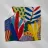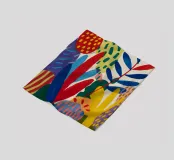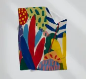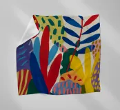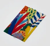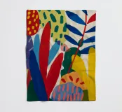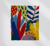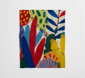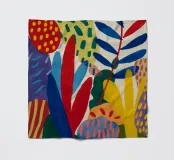 Una composizione dinamica e astratta di forme verticali, che combina foglie stilizzate e forme audaci in una ricca tavolozza di rosso, blu, viola e giallo, creando un senso di energia verso l'alto.