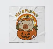 Animale capibara super carino seduto nella zucca intagliata di Halloween con un arcobaleno arancione, fiori, testo in stile autunnale citazione Ciao Zucca