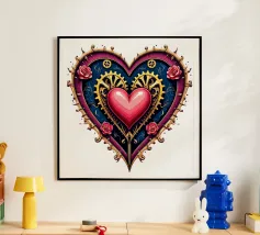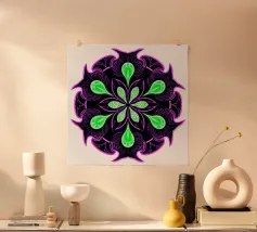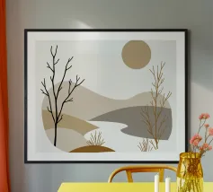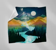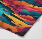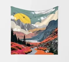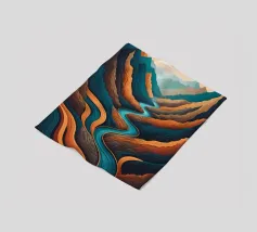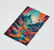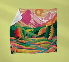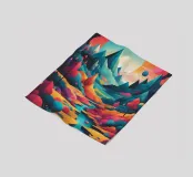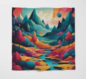 Si apre un paesaggio ipnotico, dove cime imponenti trafiggono un cielo pieno di sfere di luce. La scena è un tripudio di colori, con sfumature di arancio, rosa, blu e viola che si fondono senza soluzione di continuità. L'uso di linee spigolose e taglienti accostate a forme morbide e arrotondate crea una tensione visiva accattivante. Un fiume tranquillo si snoda nella valle, riflettendo i colori vibranti che la sovrastano. Quest'opera invita lo spettatore a esplorare un mondo in cui colore e forma danzano in perfetta armonia.