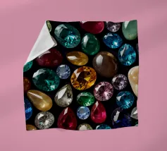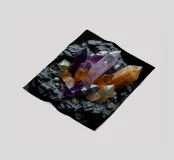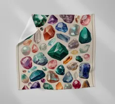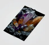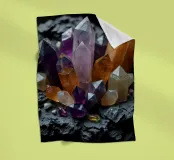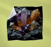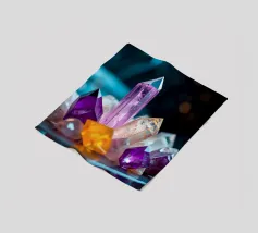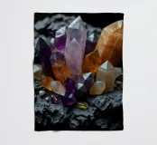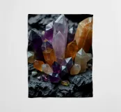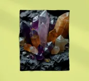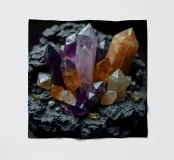 Una collezione di cristalli vibranti si trova su una base di pietra scura, che mette in evidenza le loro varie forme e colori. La luce soffusa enfatizza la bellezza e la chiarezza di ogni gemma.