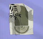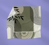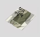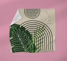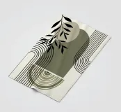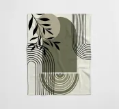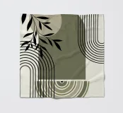 Forme geometriche astratte e linee curve creano una composizione armoniosa nei toni del verde e del nero. Un elemento botanico aggiunge un tocco organico tra le forme strutturate.