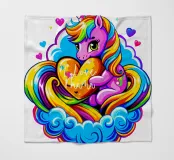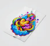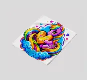 Questo adorabile unicorno, che risplende nei colori neon dell'arcobaleno, stringe un cuore stellato e fluttua su una soffice nuvola di stravagante felicità. Con i suoi grandi occhi scintillanti e una criniera che abbaglia in uno spettro di tonalità brillanti, questo disegno sembra una magica fuga in una terra dove i sogni diventano realtà. È perfetto per aggiungere una ventata di energia giocosa a qualsiasi spazio o oggetto che decora. Che siate giovani o giovani di cuore, questo allegro unicorno è qui per ricordarvi di abbracciare la magia che è in voi e di agire sempre con amore.