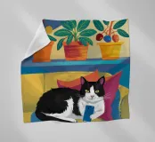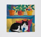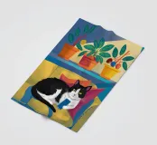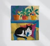 Un'illustrazione affascinante e accogliente di un gatto "smoking" bianco e nero che dorme pacificamente su un divano giallo, circondato da piante in vaso. L'opera d'arte cattura la gioia semplice e tranquilla di un pisolino.
